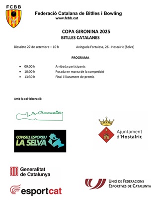 El proper dissabte 27 de setembre se celebrarà a Hostalric (Selva), una nova edició de la Copa Gironina de bitlles catalanes, En aquesta competició hi participen 64 bitllaires dels equips de les comarques gironines (i alguns de clubs del Maresme) Es tracta d’una competició individual i consta d’enfrontaments directes entre els participants seguint el quadre establert prèviament Els jugadors i jugadores es classifiquen pel campionat gràcies a les seves mitjanes de la Lliga Catalana i els Circuits Individuals